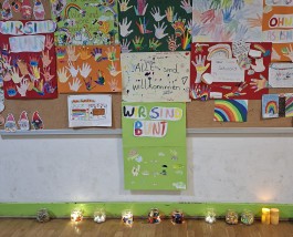 Jeden Monat gestaltet eine Klasse/Gruppe sehr farbenfroh, abwechslungsreich und kreativ unsere Pinnwand im Eingangsbereich. So fühlt man sich gleich willkommen.