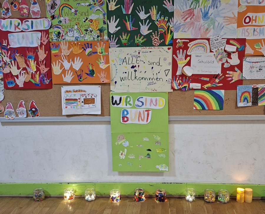 Kinderrechte und Demokratie sind ein bedeutender Baustein in unserer Schule. Alle Klassen versammelten sich darum heute am 10.12.25 zu einer Kundgebung und zeigen auf den Plakaten deutlich, dass wir eine Schule ohne Rassismus - Schule mit Courage sind und danach handeln. Einzelne Kinder haben geplant oder spontan den Mut gefasst, eine kurze Rede vor der Schulgemeinschaft zu halten. Das war für alle Anwesenden sehr bewegend. Selbstgebastelte Friedenslichter unterstützen unsere Meinung, dass jeder Mensch die gleichen Rechte hat, unabhängig von Herkunft, Geschlecht, Religion oder sozialem Status.